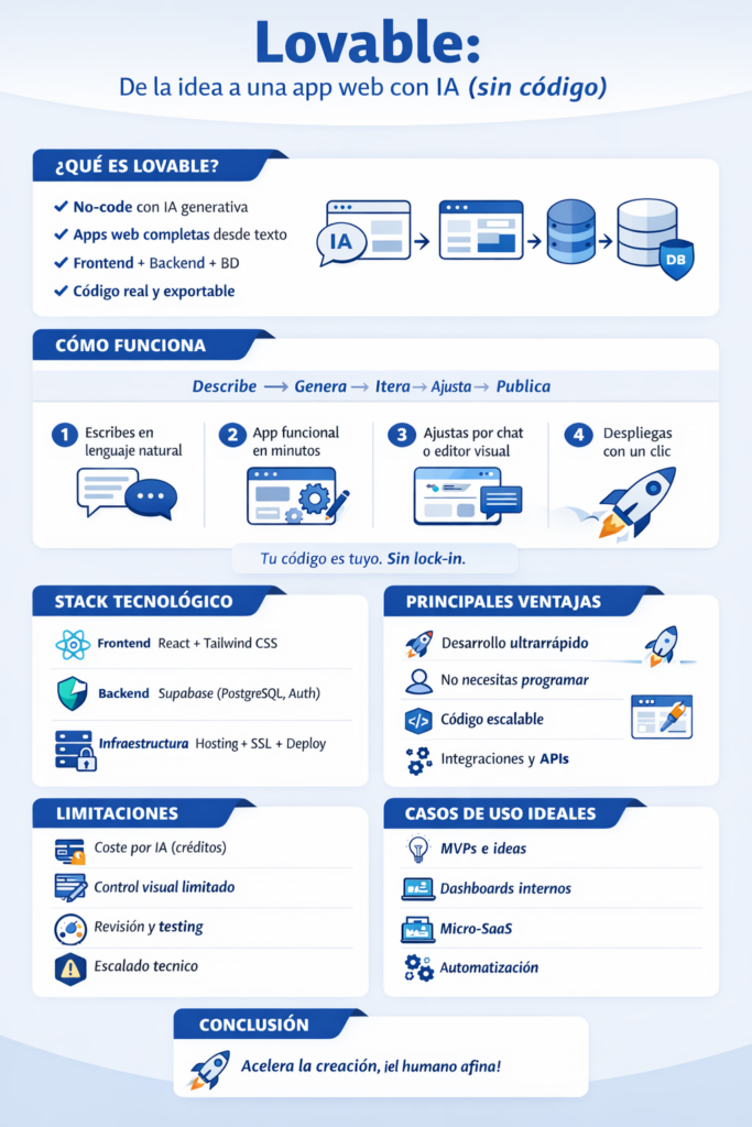 Lovable acelera el desarrollo, pero no sustituye completamente al criterio humano, especialmente en proyectos críticos o de gran escala